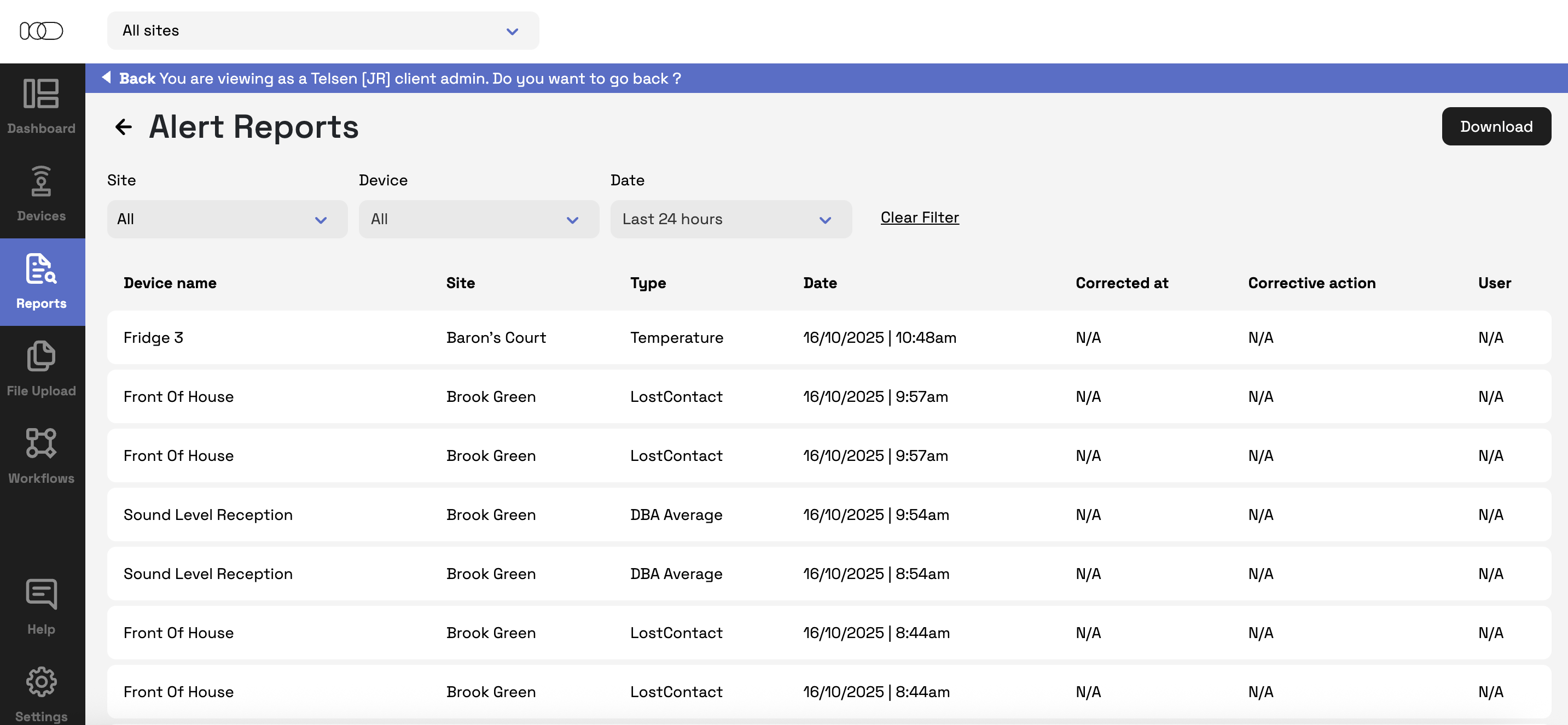 The Alerts Report provides a complete overview of all alerts generated by your devices - including temperature, contact, and environmental alerts. It also shows the corrective actions taken and who resolved each issue, helping you monitor device health, maintain compliance, and ensure smooth day-to-day operations.