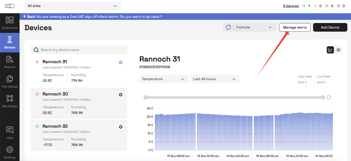 2. Once your company has at least one sensor added, the Manage alerts button becomes available.