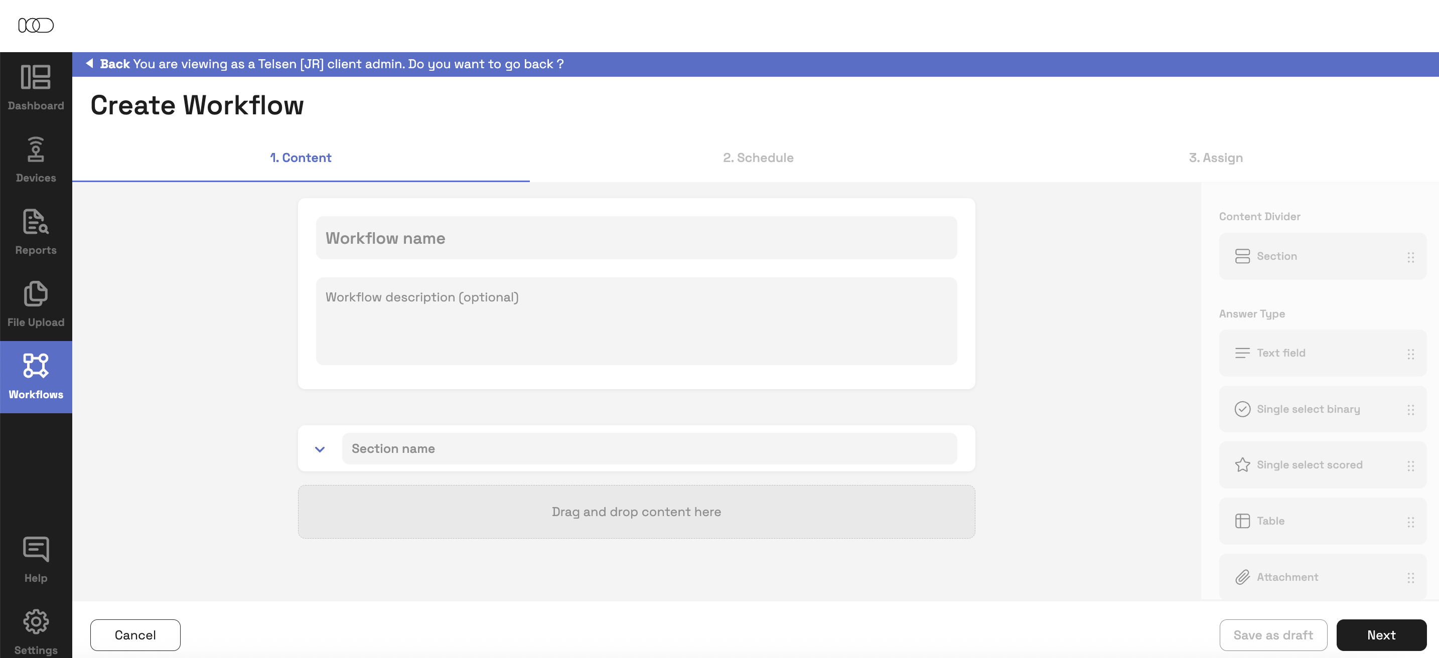 This opens the Workflow Builder where you can structure sections, tasks, questions, and answer types.