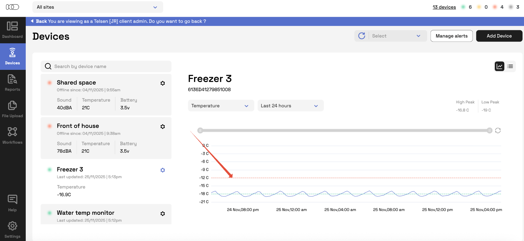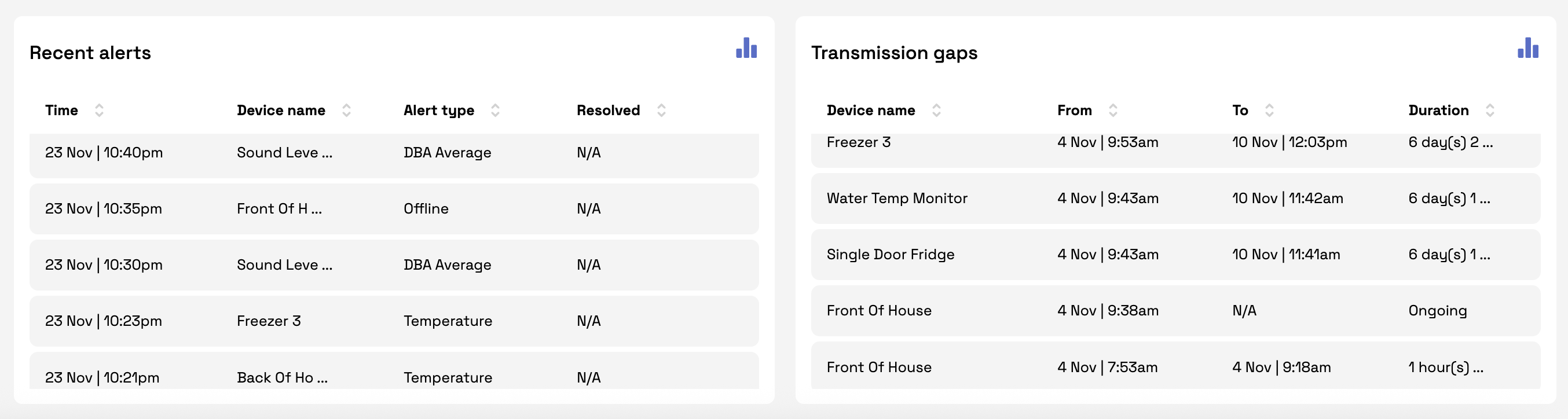 The Recent Alerts panel shows all temperature and offline alerts triggered by your sensors. You can see: